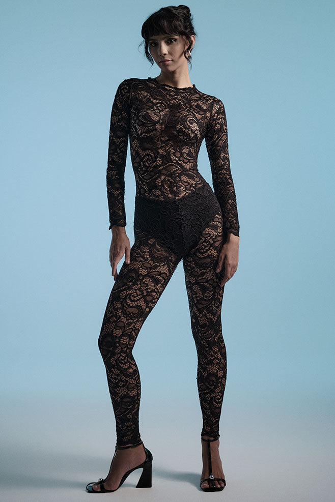Macacão longo com mangas longas em renda Luxe, confeccionado em poliamida e elastano para proporcionar o máximo de elegância e conforto.