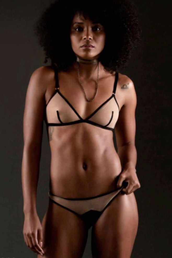 Sutiã triângulo leve sem bojo, de tule transparente, com acabamentos e recortes finalizados com elástico preto. Alças e colchetes com regulagem para ajuste. Aviamentos (argolas e reguladores) em metal dourado.